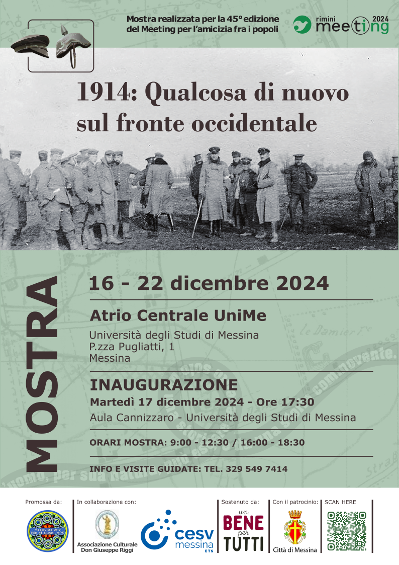 Dal 16 al 22 dicembre 2024 l’Atrio centrale dell’Università di Messina, in Piazza Pugliatti, ospiterà la mostra “1914: Qualcosa di nuovo sul fronte occidentale”.