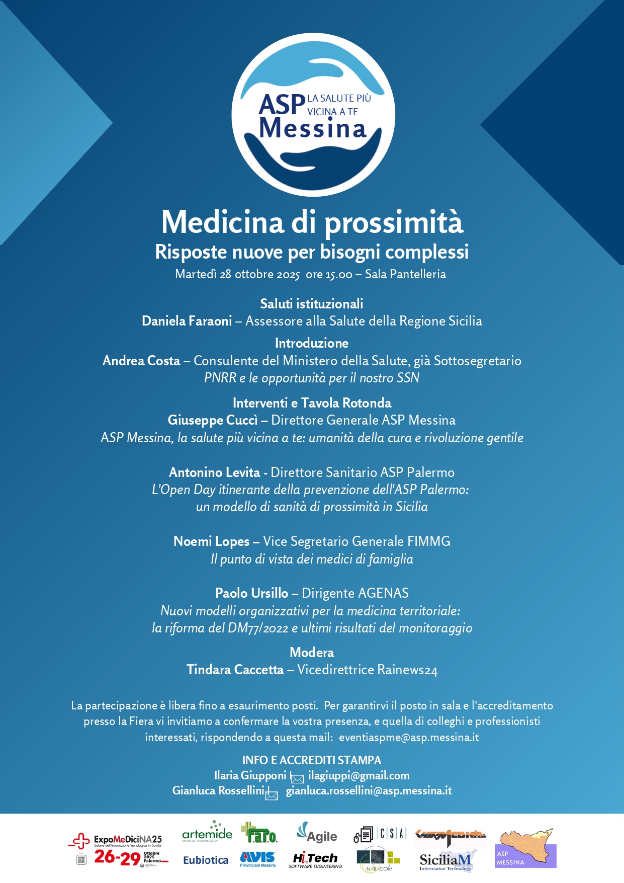 L’evento, moderato dalla professionalità della Vicedirettrice Rainews24, Tindara Caccetta, con i saluti istituzionali dell’Assessore alla Salute della Regione Sicilia, la dottoressa Daniela Faraoni, vedrà il susseguirsi degli interventi dell’ex Sottosegretario alla Salute con il governo Draghi e oggi Consulente del ministero, Andrea Costa, che parlerà di “Pnrr e le opportunità per il nostro SSN”, per proseguire con il Direttore Generale della ASP Messina, il dottor Giuseppe Cuccì, che parlerà dell’umanità della cura e della piccola “rivoluzione gentile” messa in campo dall’inizio del suo mandato e di come la tecnologia se messa a servizio dei pazienti e delle loro famiglie possa avvicinare il Ssn e i suoi servizi alle persone (“ASP Messina, la salute più vicina a te”). A seguire, il Direttore sanitario dell’ASP di Palermo, il dottor Antonino Levita, racconterà il modello sperimentato sotto la sua direzione “L’Open day itinerante della prevenzione dell’ASP Palermo: un modello di sanità di prossimità in