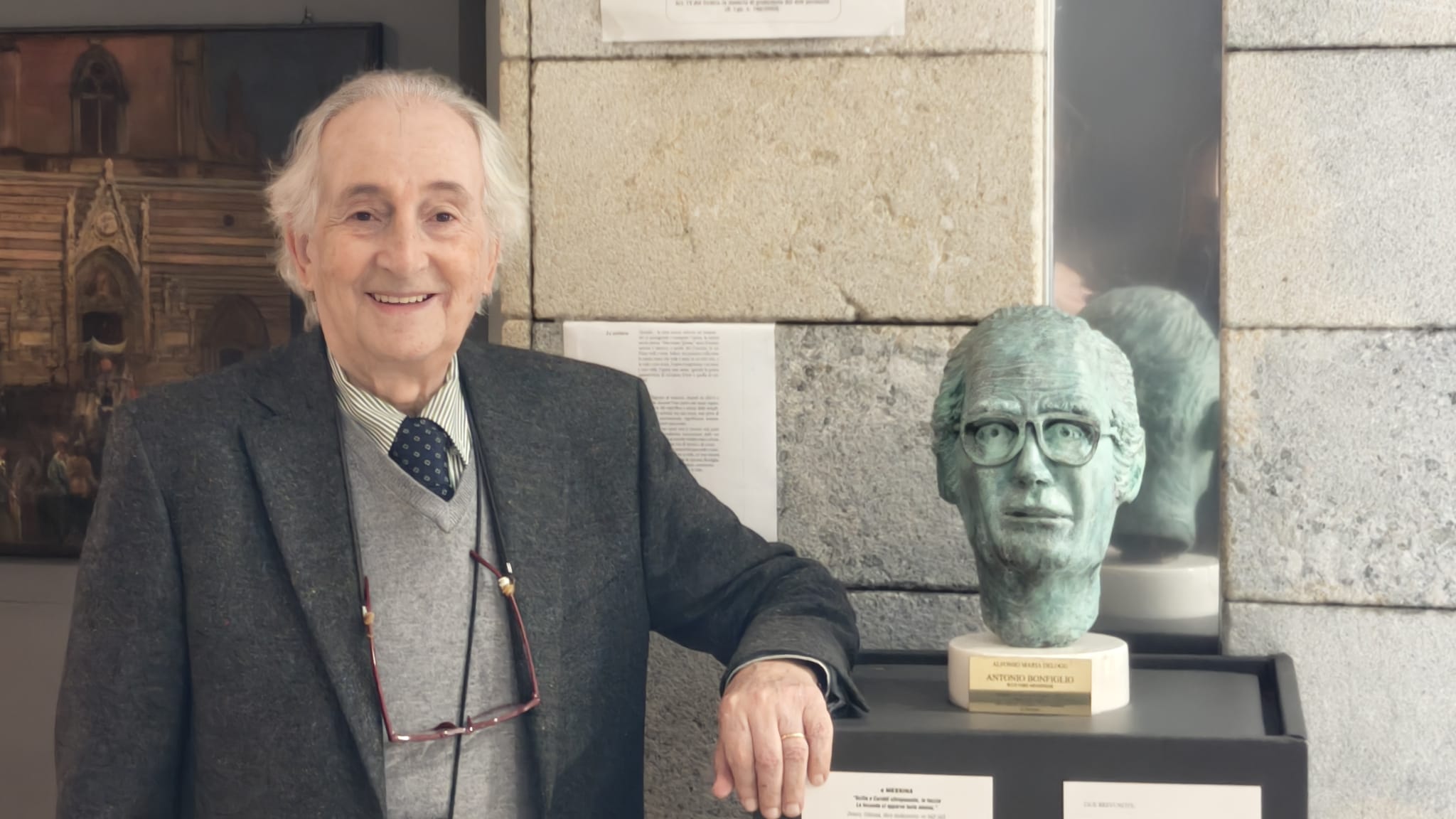 Significativo oggi l’incontro tra due ex allievi dello scultore Bonfiglio: il prof. Delogu e lo scultore Giuseppe Brancato; presenti alla cerimonia la dott.ssa Giovanna Famà, in rappresentanza del Museo Regionale, e l’Associazione Antonello da Messina, presieduta da Milena Romeo, che ha conferito a Roma al prof. Delogu il premio Antonello da Messina.